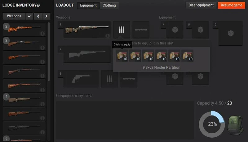 Im Rucksack, den der Jäger bei der Jagd mitführt, sind alle Gegenstände wie Waffen, Caller etc. enthalten. Auf diese Gegenstände kann der Jäger während der Jagd zurückgreifen. Sie bilden das sog. Inventar.