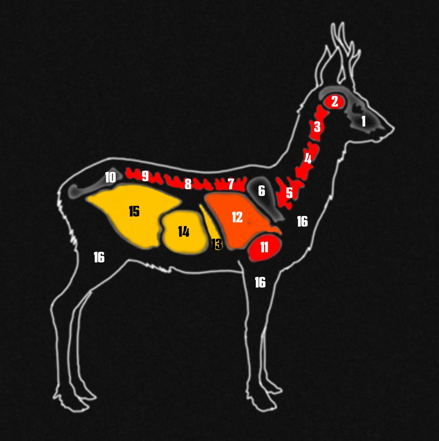 | 16 | Muskel bzw. Fettgewebe | Dies sind die "Körper"- Treffer, also immer dann wenn keines der oben beschriebenen Organe getroffen wurde. Körpertreffer sind sehr schlecht und führen meist erst nach langen Fluchtstrecken zum Tode. Außnahmen sind hier bei Geschossen mit einer sehr hohen Schockwirkung zu erwarten, wobei das Tier schnell oder fast auf der Stelle durch einen Schock/ ein Trauma stirbt. |