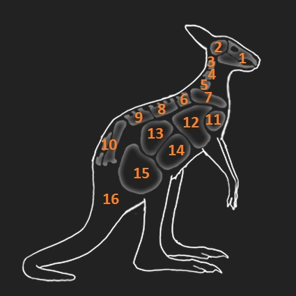 | 10 | Beckenknochen | Ein sehr stabiler Knochen, bei dem ein Treffer vermieden werden sollte. Das Wild stirbt oft erst nach langer Zeit. Der Beckenknochen befindet sich in einem Bereich auf den man seine Waffe nie richten sollte. Vitale Organe gibt es in der Nähe nicht wirklich und der Schuss wird kaum Erfolge bringen. |