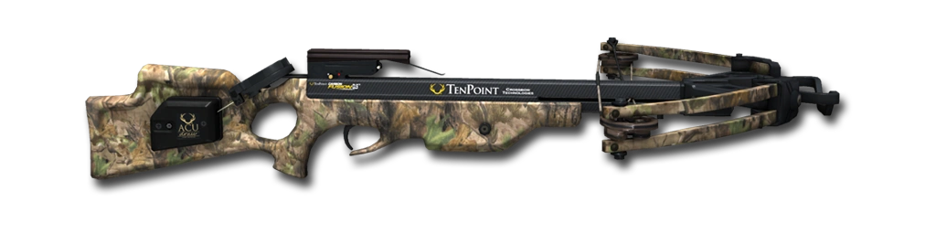Bei dieser Waffe handelt es sich um eine Armbrust des Herstellers "Tenpoint". Die Armbrust (engl. Crossbow) ist aus Carbon gefertigt und besitzt eine Tarnfärbung / Optik (Camo).