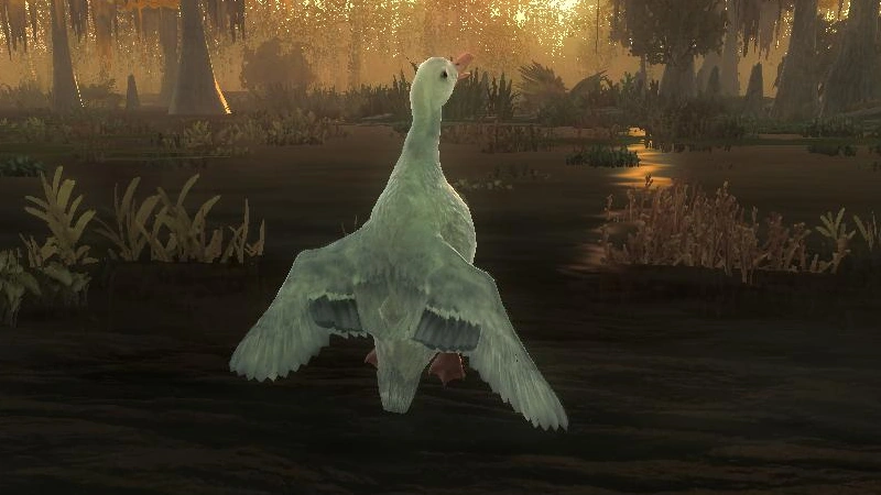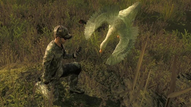 The constant movements of swimming ducks or walking geese can make shots with a bow or crossbow a nice challenge. Shooting birds with bows further out will not spook nearby fellows. The real deal however is to shoot the birds in the air! Whistle with the "Make sound" key (default: F; see Controls) to flush the birds just as you do with the pheasants. You will receive a score for birds shot on the water ("G" score), but only birds shot in the air ("A" score) will count for competitions, leaderboards and missions. So make good use of your shotguns! The constant supply of new flocks will need you to be equipped with plenty of Birdshot ammunition! Shot waterfowl will drop dead to the ground or water surface. In water they might float to the other side of a river or lake, but you should always be able to retrieve them. Consider using a retriever dog for collecting shot birds.