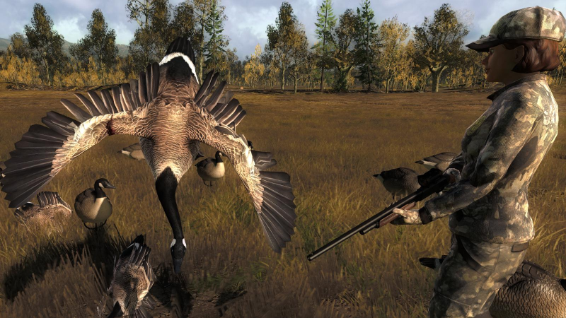 The constant movements of swimming ducks or walking geese can make shots with a bow or crossbow a nice challenge. Shooting birds with bows further out will not spook nearby fellows. The real deal however is to shoot the birds in the air! Whistle with the "Make sound" key (default: F; see Controls) to flush the birds just as you do with the pheasants. You will receive a score for birds shot on the water ("G" score), but only birds shot in the air ("A" score) will count for competitions, leaderboards and missions. So make good use of your shotguns! The constant supply of new flocks will need you to be equipped with plenty of Birdshot ammunition! Shot waterfowl will drop dead to the ground or water surface. In water they might float to the other side of a river or lake, but you should always be able to retrieve them. Consider using a retriever dog for collecting shot birds.
