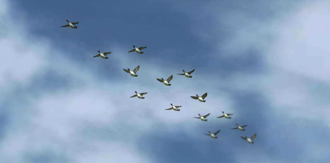 Waterfowl spawns outside the map and flies over the reserve. After leaving the reserve, the same birds can reappear again in another flock later on. You may recognize this yourself when you spot a rare bird such as a Black Hybrid Mallard multiple times. Waterfowl flocks are always mixed groups of males and females. Duck flocks can also be a mix of different species, especially as your hunt progresses to an hour or more.