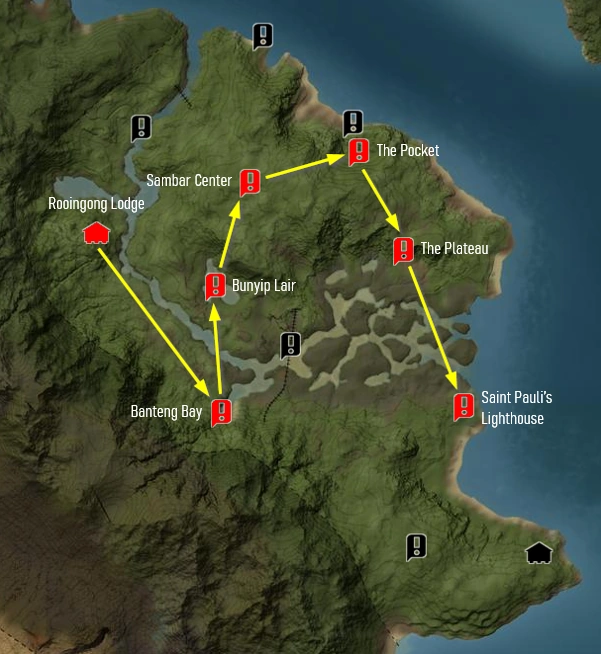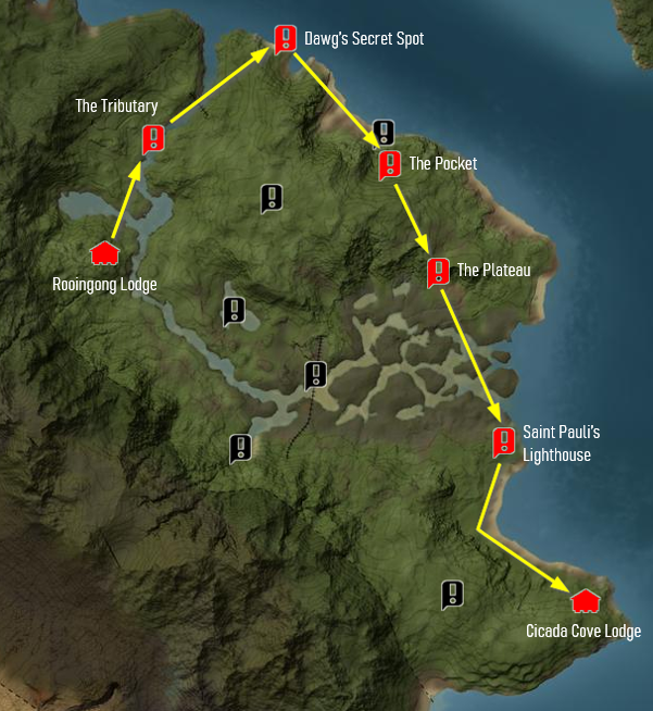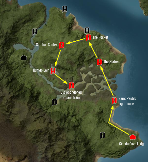 This is a community made map and is based on players' experience in the game. It is a simple attempt to display where animals spawn in this reserve, and NOT where you might find them during a hunting session. The map shows where you can expect to find the animals in maybe 80% of your hunts right after you start the game. The animals can also appear in other places, but they will with less frequency.