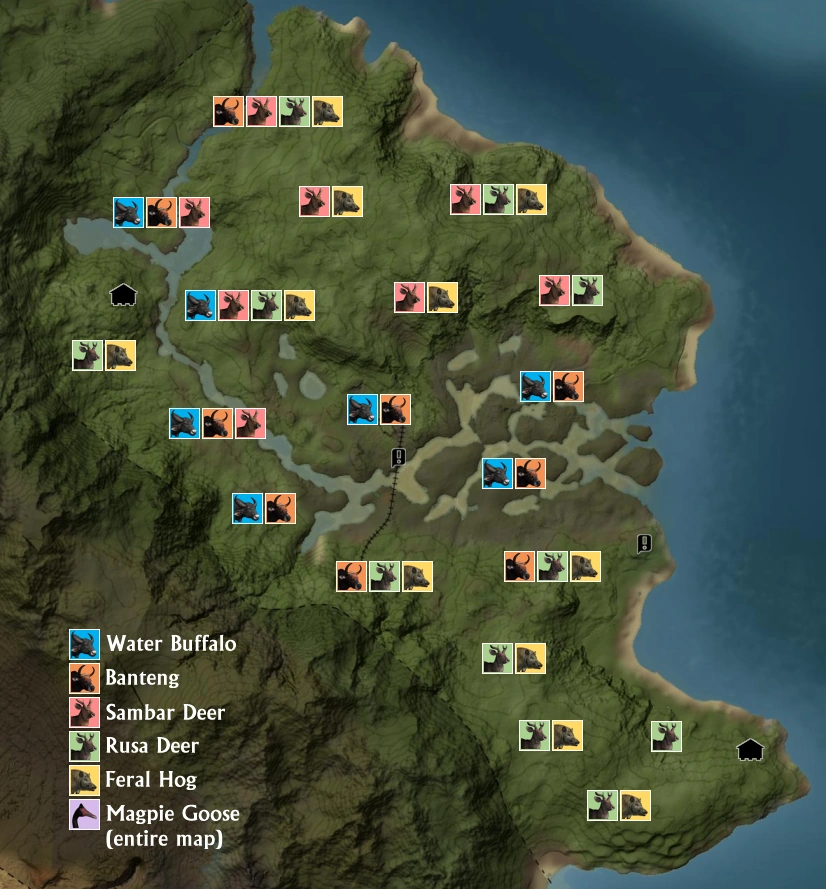 The animals are shown on the map in clusters. This approach does not do the game perfect justice, but the map becomes easy to understand. Imagine a circle around each cluster and you will get an idea about their predominant spawning locations.