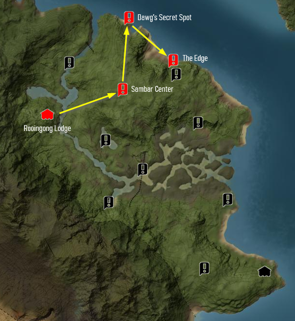 Then arrive at Dawg's Secret Spot (X: 5929, Y: 5734) in the same hunt.